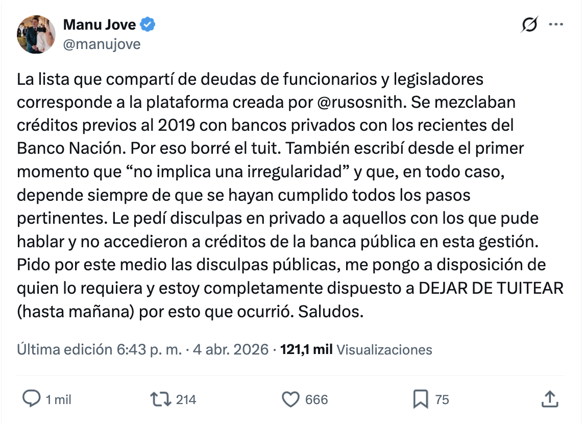 Jove publicó un hilo en X en el que difundió “la lista (casi) completa de quienes accedieron a los créditos millonarios del Banco Nación”. En el texto acompañante afirmaba que la mera inclusión en esa lista generaba “ruidos” y que, aunque no necesariamente implicaba irregularidad, era necesario “despejar controversias”.