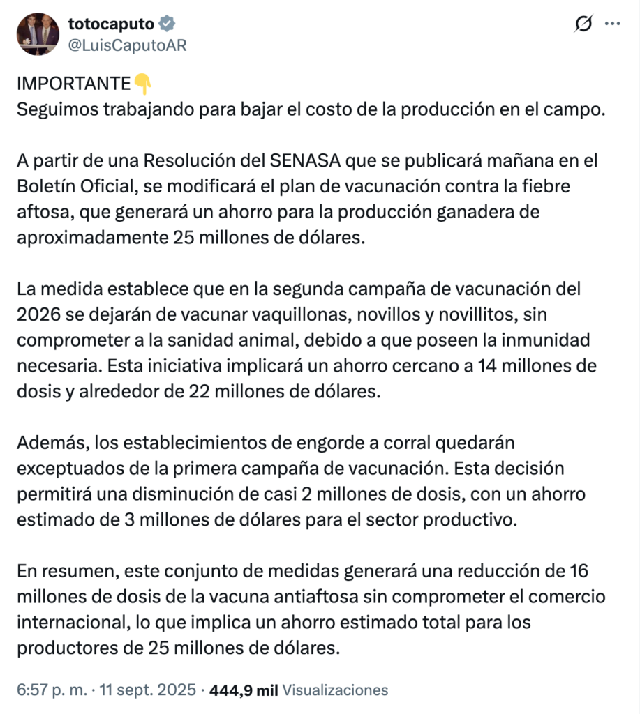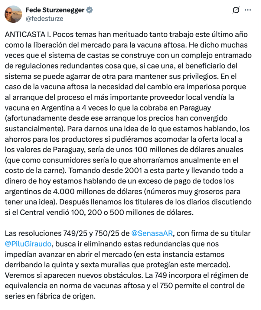 FINALMENTE: “Ahora cada productor puede comprar la vacuna a quien le plazca y se puede comprar para ser entregada en el campo mismo (por ejemplo con un camión o camioneta refrigerada) garantizando la cadena de frío. Más barato y mejor. La resolución también sube al ruedo a los veterinarios que podrán registrarse libremente para ellos también ofrecer el servicio, quizás comprando las vacunas a un distribuidor nacional, al ente o directamente a los laboratorios. Los entes seguirán, pero ahora estarán obligados a competir en un ecosistema mucho más diverso.”