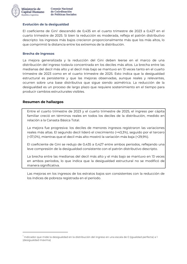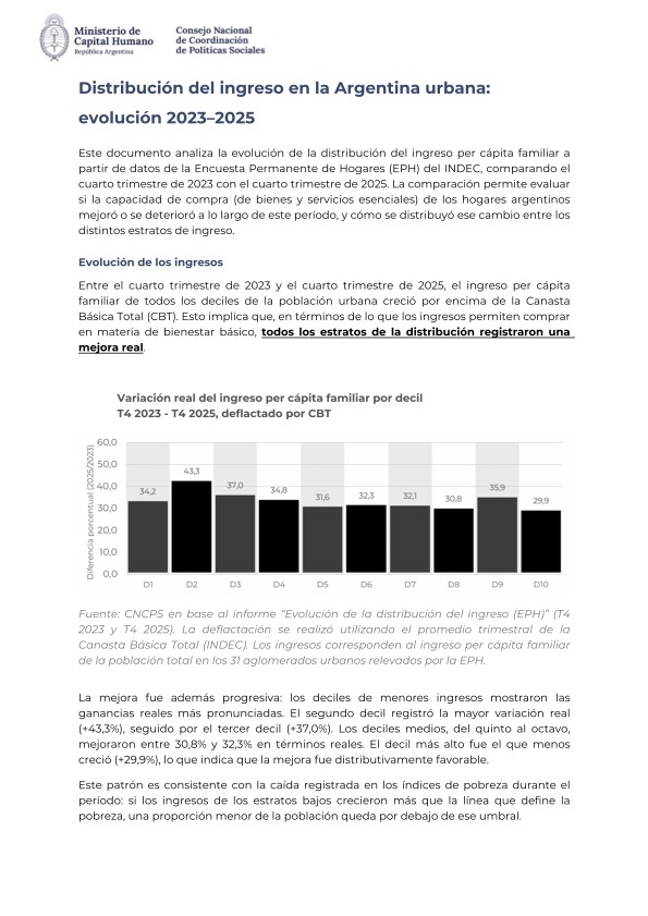 Un informe elaborado por el Consejo Nacional de Coordinación de Políticas Sociales, dependiente del Ministerio de Capital Humano, analiza la evolución de los ingresos en la Argentina.