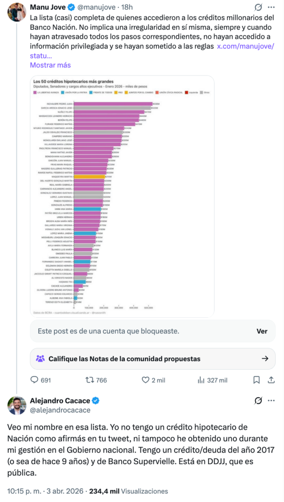 Jove publicó un hilo en X en el que difundió “la lista (casi) completa de quienes accedieron a los créditos millonarios del Banco Nación”. En el texto acompañante afirmaba que la mera inclusión en esa lista generaba “ruidos” y que, aunque no necesariamente implicaba irregularidad, era necesario “despejar controversias”.