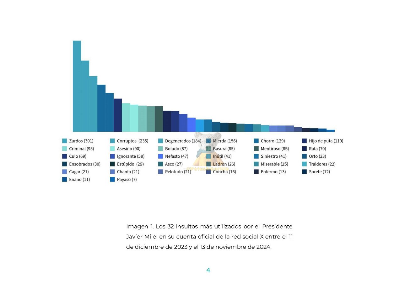 Así, identificamos los 32 agravios más utilizados por Milei en su cuenta de X. Encontramos que desde que asumió como Presidente, Milei ha utilizado estos 32 términos para insultar y descalificar a personas y organizaciones 2200 veces, esto es casi 7 (6,5) veces por día, solamente desde su cuenta de X.”