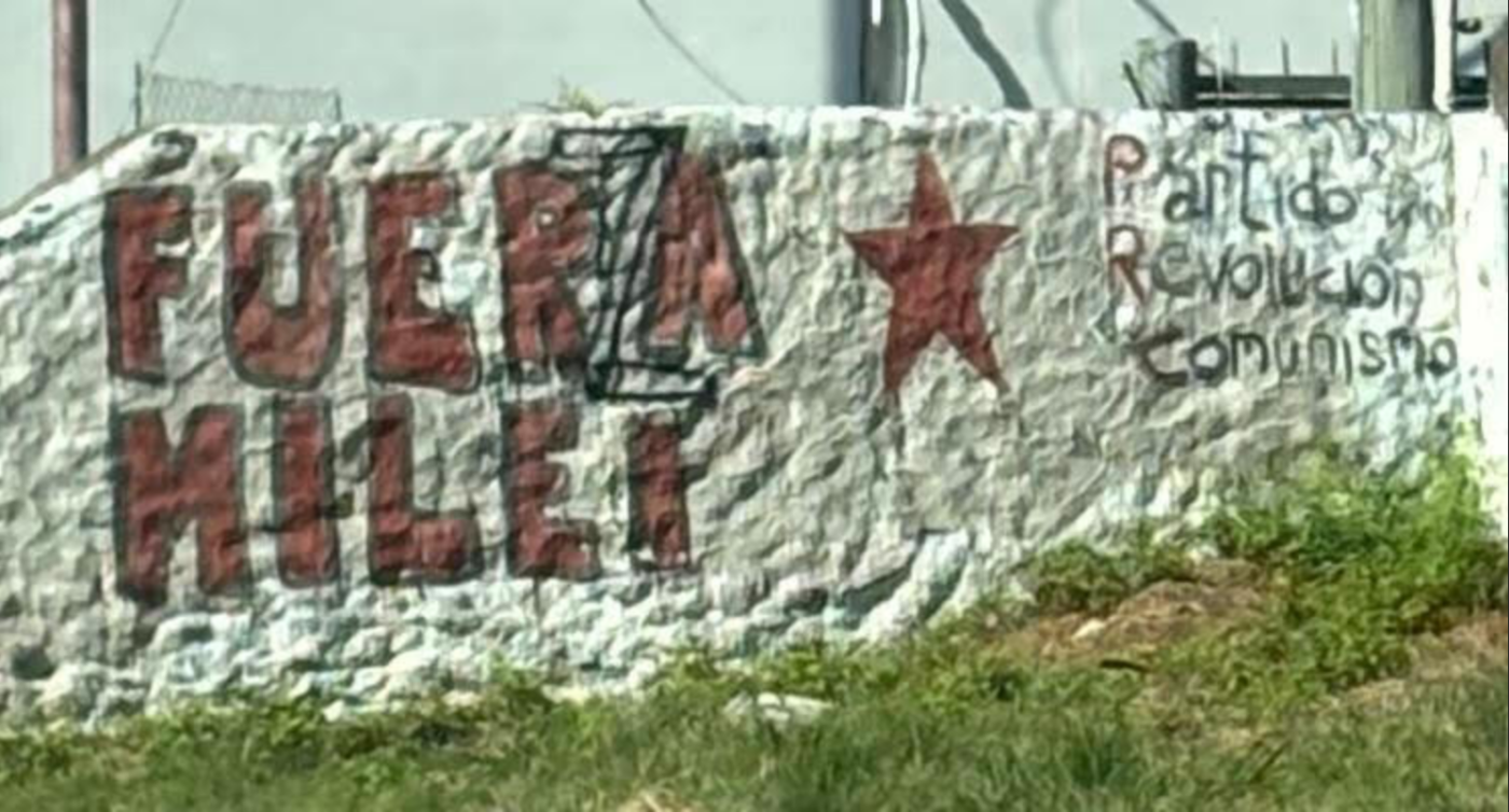 En la foto se vislumbra el choque de dos eras. Primero, la pared tomada por la vieja estructura: letras rojas y grandes, de formato proselitista. Es el grito de una agrupación de izquierda, cuyos líderes desconocemos pero que seguramente sus presupuestos pagamos. Exigen que el Presidente se vaya “FUERA MILEI”. Es el alarido de un sistema que se resiste a morir y de una jerarquía invertida que ve amenazado su estatus de “Rey sin Dios”.