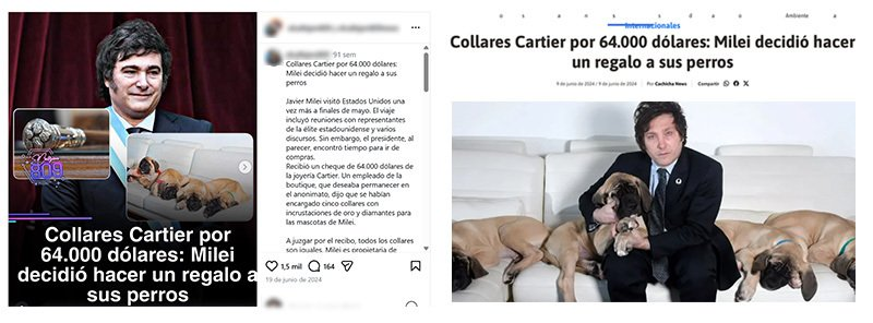 Otra línea de propaganda buscó explotar la extravagante relación de MIlei con sus perros. “Objetivo y descripción: Inyectar una noticia sobre Milei comprando cinco collares para perros de Cartier por valor de 64.000 dólares en EEUU”, dice uno de los documentos. No hay referencias sobre dónde se publicó esto, pero un artículo idéntico apareció en un sitio web de República Dominicana y en una publicación de Instagram.