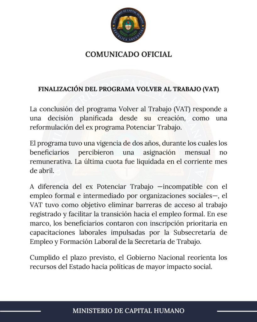 El Ministerio de Capital Humano de la Nación anunció hoy la finalización definitiva del Programa Volver al Trabajo (VAT) y su reconversión en un Sistema de Vouchers para formación profesional.Según el comunicado oficial publicado en la cuenta @MinCapHum_Ar, el programa —que había reemplazado al ex Potenciar Trabajo— cumplió su plazo previsto de dos años. Durante ese período, los beneficiarios recibieron una asignación mensual no remunerativa, y la última cuota se liquidó en abril de 2026.