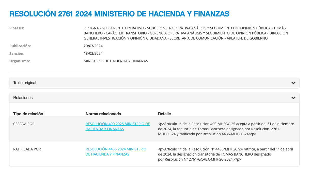 Pero hay más: Banchero no es un encuestador independiente cualquiera. Según el Boletín Oficial de la Ciudad de Buenos Aires, fue designado como Subgerente Operativo de Análisis y Seguimiento de Opinión Pública en la Secretaría de Comunicación del Gobierno de la Ciudad